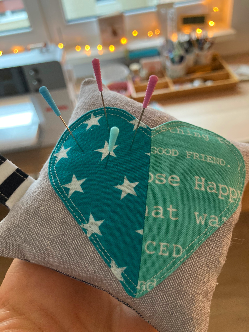 Wenn du mal eine Nähflaute hast (und das bedauerst), kann ich dir empfehlen, ein paar Nadelkissen zu nähen. Klein, überschaubar, schnell gemacht – Ich war einen Nachmittag lang komplett im kreativen Flow mit meinen Nadelkissen. 😀 Die Ideen sind nur so gesprudelt, und es hat mir sehr viel Spaß gemacht, sie alle umzusetzen. Gerade weil ich dabei auch Überbleibseln wie der Herz-Applikation neues Leben einhauchen konnte (übrig von meiner Anleitung Zuziehbeutel).