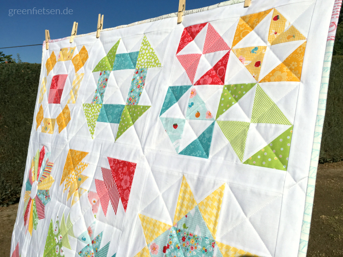Die Krabbeldecke ist ein klassicher 3-lagiger Quilt, bestehend aus der Vorderseite, einem Vlies in der Mitte und einem Rückseitenstoff. Für die Rückseite habe ich einen extrabreiten, gepunkteten Grunge-Stoff von Moda verwendet. Im Prinzip ein toller Stoff, allerdings feingewebt und sehr glatt. Meine Maschine hatte leider ein paar Schwierigkeiten mit dem Stofftransport, was dazu geführt hat, dass das Stichbild auf der Rückseite nicht immer gleichmäßig aussieht. Gequiltet habe ich diagonal mit einfachem Geradstich knapp neben den Nähten.
